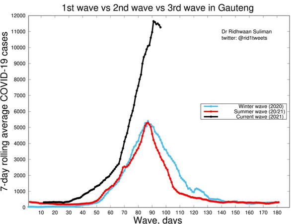 The graph below is by Ridhwaan Suliman, a senior researcher at CSIR. It shows the comparison between all three waves as of the 8th of July 2021.