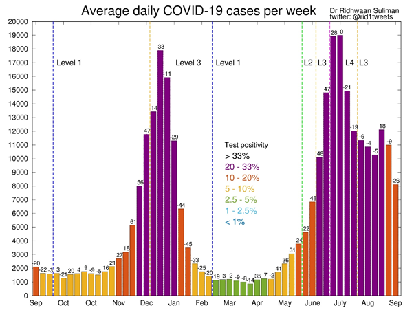 - Average daily COVID-19 cases per week