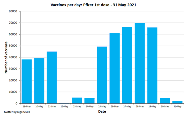Vaccine rate is steadily increasing but falling far short of targets. Weekends are not being utilized signalling perhaps a lack of vaccine urgency.