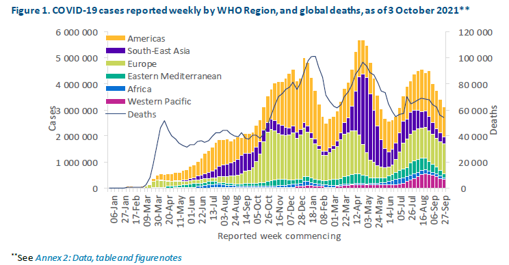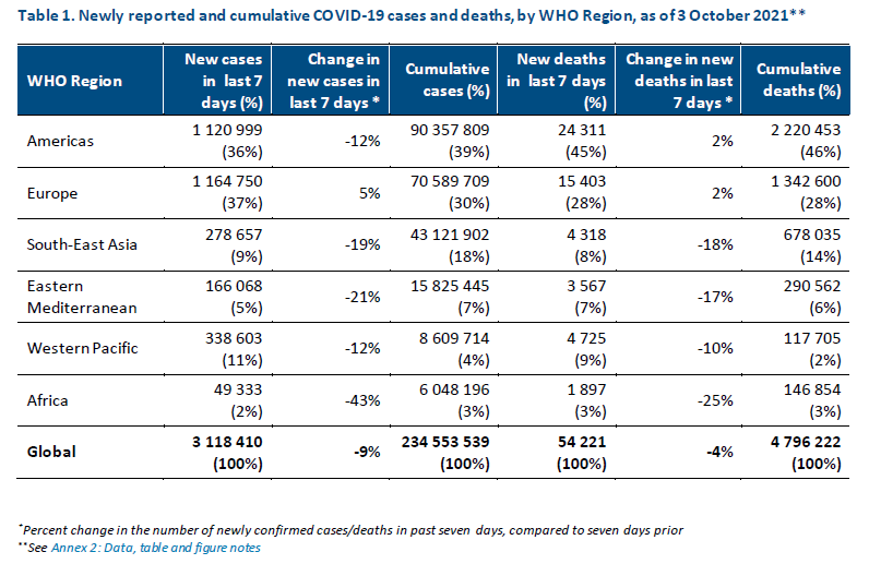 Globally, the numbers of weekly COVID-19 cases and deaths continued to decline. This is a trend that has been observed since August (Figure 1). Over 3.1 million new cases and just over 54 000 new deaths were reported during the week of 27 September to 3 October 2021. Cases this week decreased by 9% as compared to the previous week, while the number of deaths remained similar to that of the past week (Table 1). All regions reported a decline in the number of new cases this week apart from the European Region which reported a number similar to that of the previous week. The largest decrease in new weekly cases was reported from the African Region (43%), followed by the Eastern Mediterranean Region (21%), the South-East Asia Region (19%), the Region of the Americas (12%) and the Western Pacific (12%). The cumulative number of confirmed cases reported globally is now over 234 million and the cumulative number of deaths is just under 4.8 million.