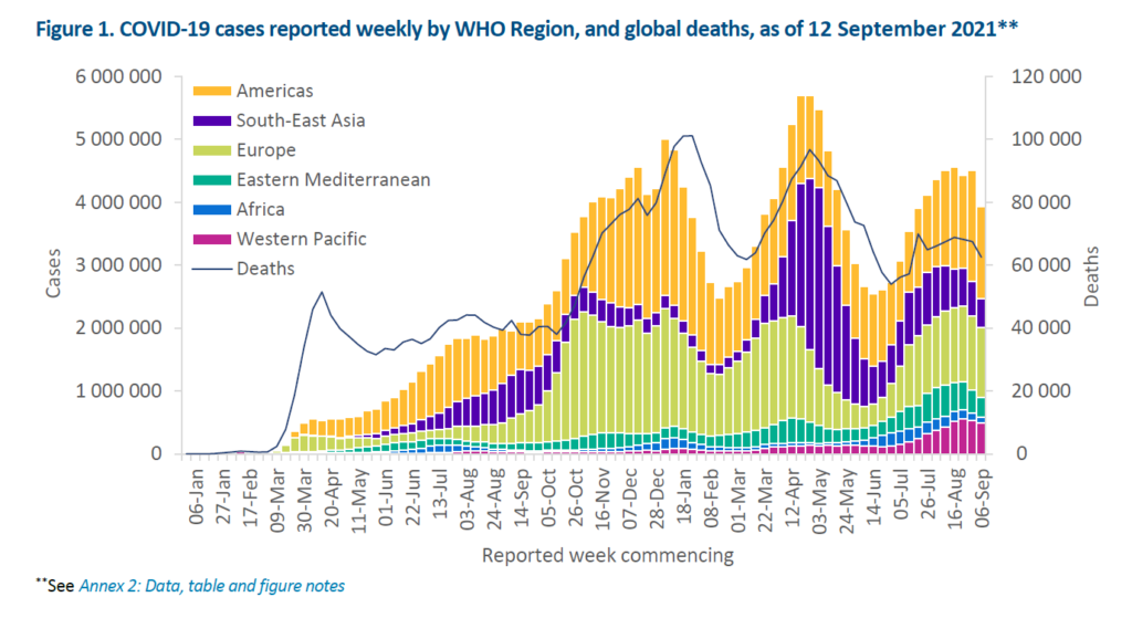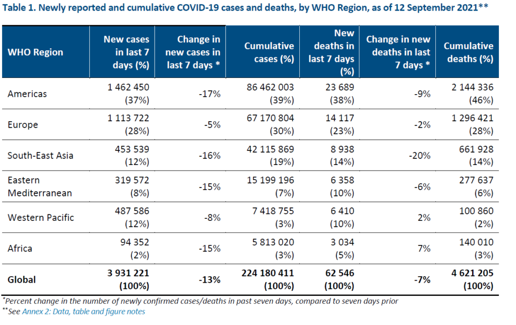 With nearly 4 million new cases reported globally in the past week (6-12 September), this represents the first substantial decline in weekly cases in more than two months (Figure 1). All regions reported declines in new cases as compared to the previous week.