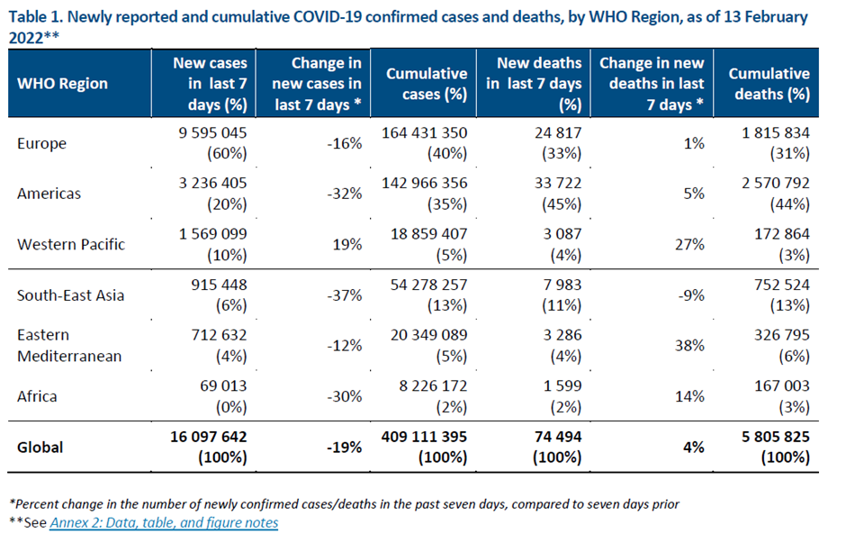 Globally, during the week of 7 to 13 February 2022, the number of new COVID-19 cases decreased by 19% as compared to the number reported during the previous week, while the number of new deaths remained similar to that of the previous week (Figure 1). Across the six WHO regions, just over 16 million new cases and just under 75 000 new deaths were reported (Table 1). As of 13 February 2022, over 409 million confirmed cases and over 5.8 million deaths have been reported globally.