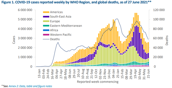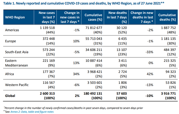 The global number of new cases over the past week (21-27 June 2021) was over 2.6 million, a similar number compared to the previous week (Figure 1). The number of weekly deaths continued to decrease, with more than 57 000 deaths reported in the past week, a 10% decrease as compared to the previous week. This is the lowest weekly mortality figure since those recorded in early November 2020. Globally, COVID-19 incidence remains very high with an average of over 370 000 cases reported each day over the past week. The cumulative number of cases reported globally now exceeds 180 million and the number of deaths is almost 4 million.