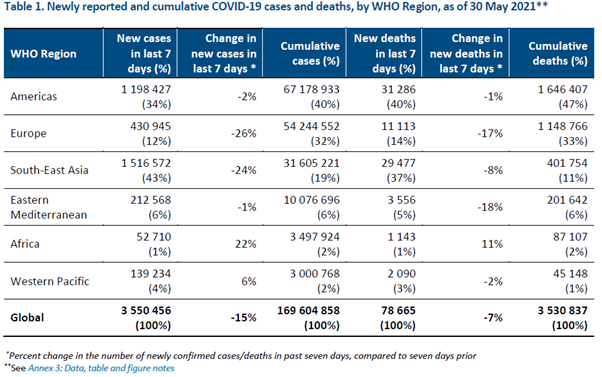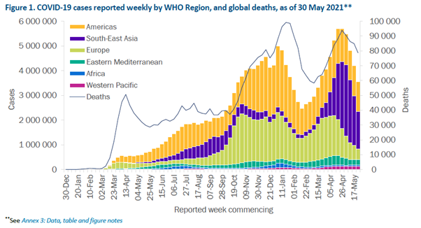 Over the past week as of the 01st June 2021, the decrease of COVID-19 new cases and deaths around the world has continued.