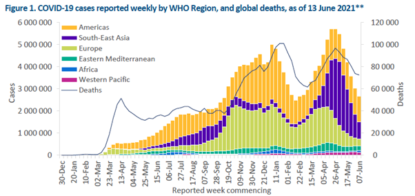 Over the past week as of the 13th June 2021, the decrease of COVID-19 new cases and deaths around the world has continued.