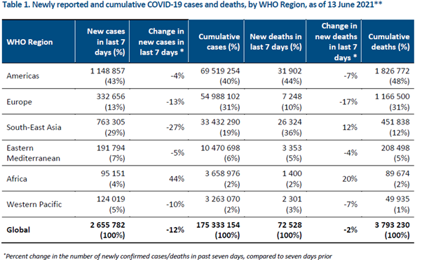 Global COVID-19 Status as New Cases and Deaths Decrease as of the 13th June 2021